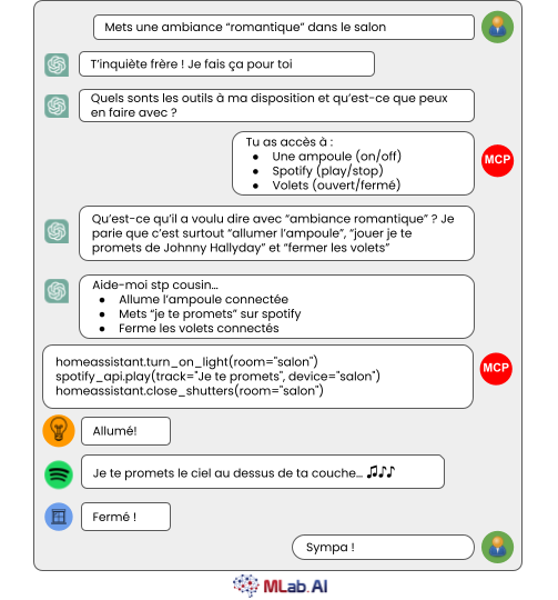 L’IA conversationnelle permet de prendre une commande en langage naturel (« mets une ambiance romantique »), et la transformer en actions concrètes grâce à un serveur MCP qui convertit cela en instructions techniques exécutables par les outils qui sont connectés.